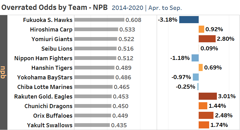 kbo리그 뿐 아니라 mlb나 npb역시 비슷합니다. 강팀은 과소평가되고 약팀은 과대평가됩니다. 왜 그런지 맥락을 찾아보는건 좀더 많은 분석이 필요하겠지만 관찰된 결과로 본다면 "도박사는 약팀을 좋아해"입니다.