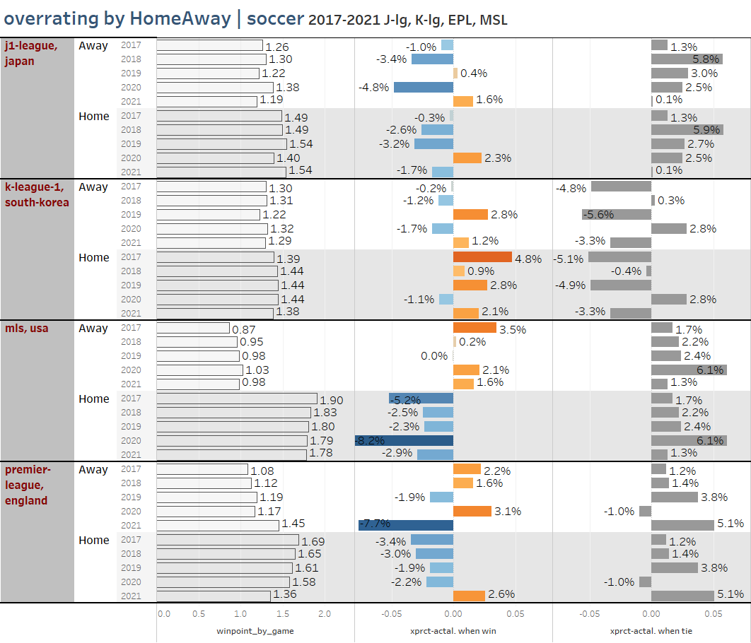 1. 어느 리그에나 홈어드밴티지는 있습니다. 그런데 리그마다 크기가 다릅니다. 그리고 그 크기는 매년 거의 비슷하게 반복됩니다. 그렇다면 리그에 따라 홈어드밴티지의 크기는 고유한 특징이라 추측해볼 수 있습니다. K리그가 가장 작은 편이고 MLS가ㅣ 제일 큽니다.
