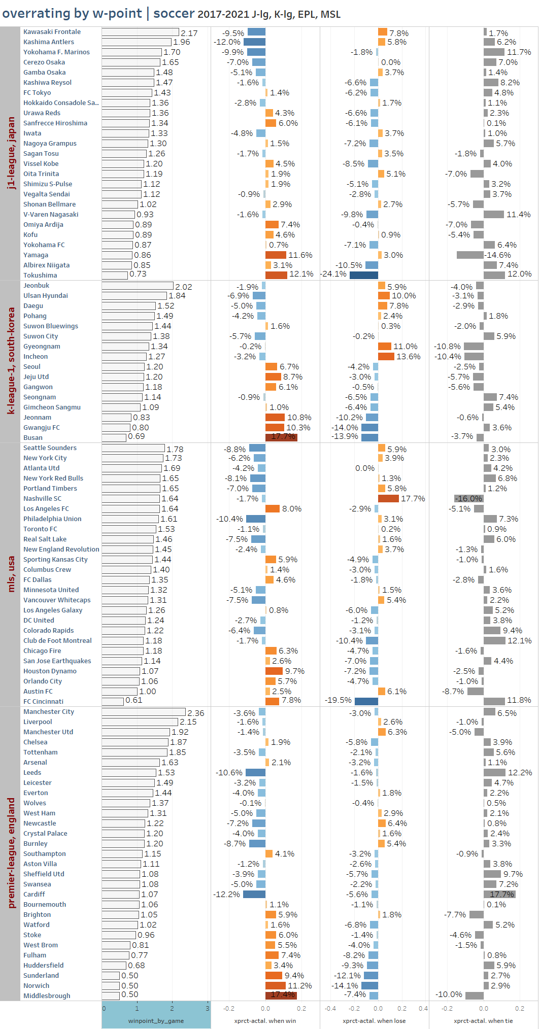 2. J리그, MLS, EPL는 대체로 (야구와 마찬가지로) 홈팀 승률이 과소평가됩니다. K리그는 약간 특이한데, 홈팀 승률이 거꾸로 과대평가되는 대신, 무승부 확률이 많이 과소평가됩니다. 홈팀이 그래도 더 많이 이길거라고 예상했음에도 이기지 못하고 비기는 경우가 많았습니다.